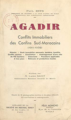 Droit immobilier Livres ~ Agadir conflits immobiliers des confins sudmarocains 19111932 Histoire droit immobilier marocain berbère israélite conflits anciens conciliation aménagement dune ville de 912 hectares urbanisme procédure applicable à tous pays richesses et productions locales Préface par M Lucien Saint